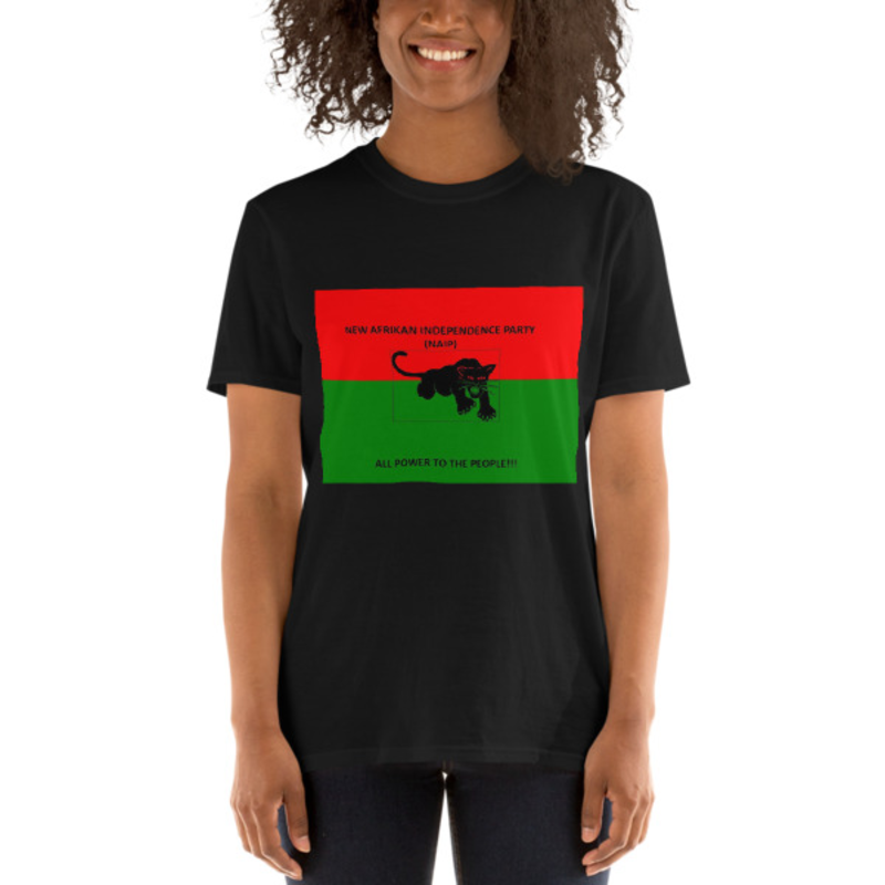 Classic New Afrikan Independence Party (NAIP) red and green square logo: Gildan 64000 Unisex Softstyle T-Shirt (black) with Tear Away Label